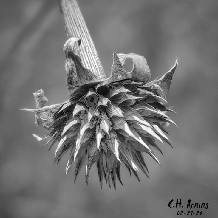 My 02/19/26 postcard is a sunflower in a yard along Southern; the bloom is gone,…