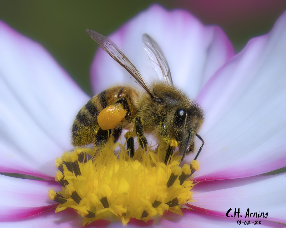 My 10/02/25 features a honeybee at Altura Park; it’s dusted in pollen, working the heart of a white-and-pink cosmos flower,…