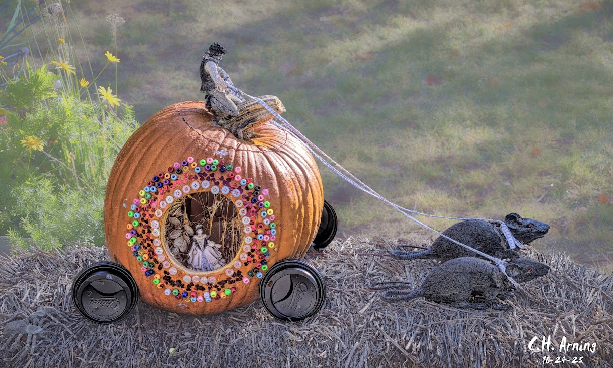 My 10/24/25 postcard captures a playful autumn scene from a yard on Solano Drive, a reimagined Cinderella’s carriage: a pumpkin turned into a button-framed coach, complete with a toy passenger, Jimi Hendrix at the reins, and two dark mice pulling the load. With coffee lids for wheels and a bed of straw beneath, bathed in soft morning light, the scene blends fairytale whimsy with homemade creativity, a touch of Halloween humor wrapped in childlike wonder.