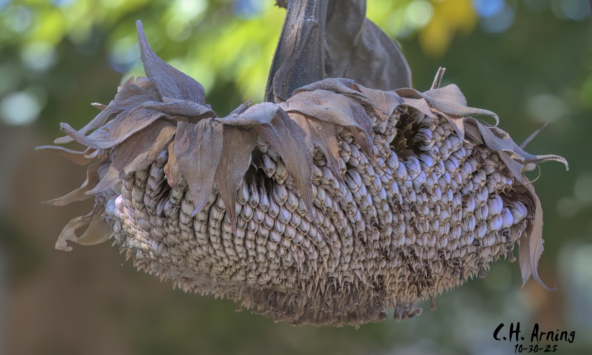 My 10/30/25 postcard captures a sunflower at the end of its life, its petals curled and crisp, its once-bright face heavy with seeds and bowed toward the earth. The muted browns and grays convey a sense of completion rather than decay. It’s a portrait of endurance, sunlight stored, purpose fulfilled.