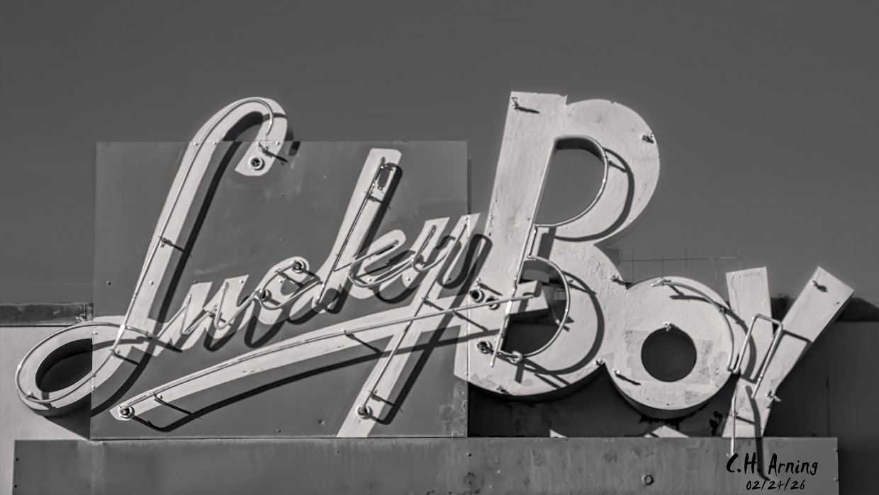 My 02/24/26 postcard is an aging “Lucky Boy” sign that rises above a longtime Albuquerque burger joint near Constitution and Carlisle. Faded, weathered letters, and stubborn neon give it character. It’s a little rough, a little nostalgic, burgers and Chinese food under the same roof, holding its ground against time.