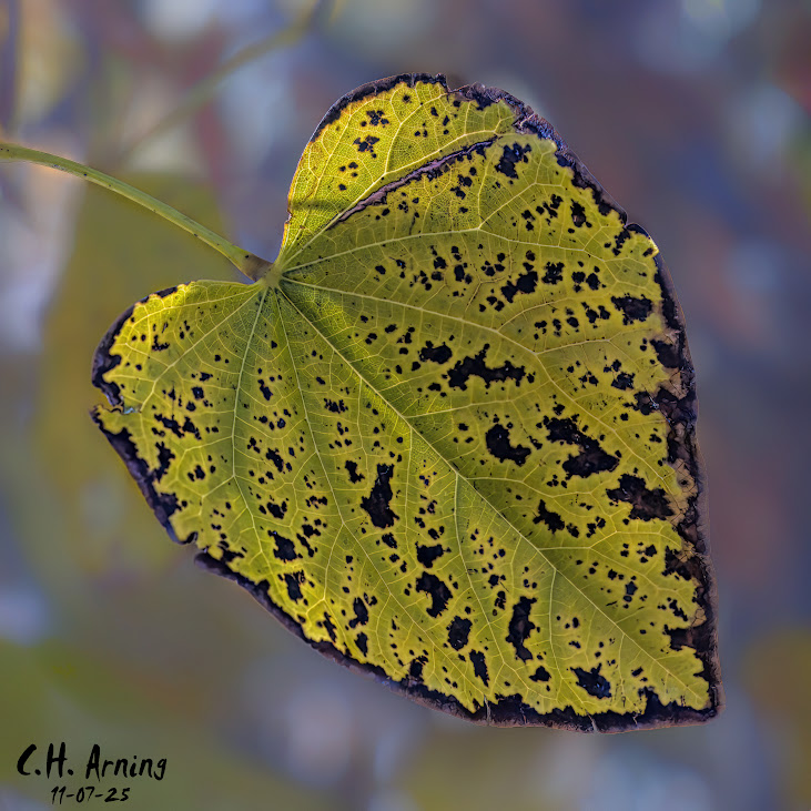 My 11/07/25 postcard features a heart-shaped leaf hanging in the soft fall light, its surface mottled with dark spots and edges curling toward black from the cold nights. As decay begins to claim its border, the leaf feels both fragile and stubborn, a quiet record of a season passing, marked but still holding on.